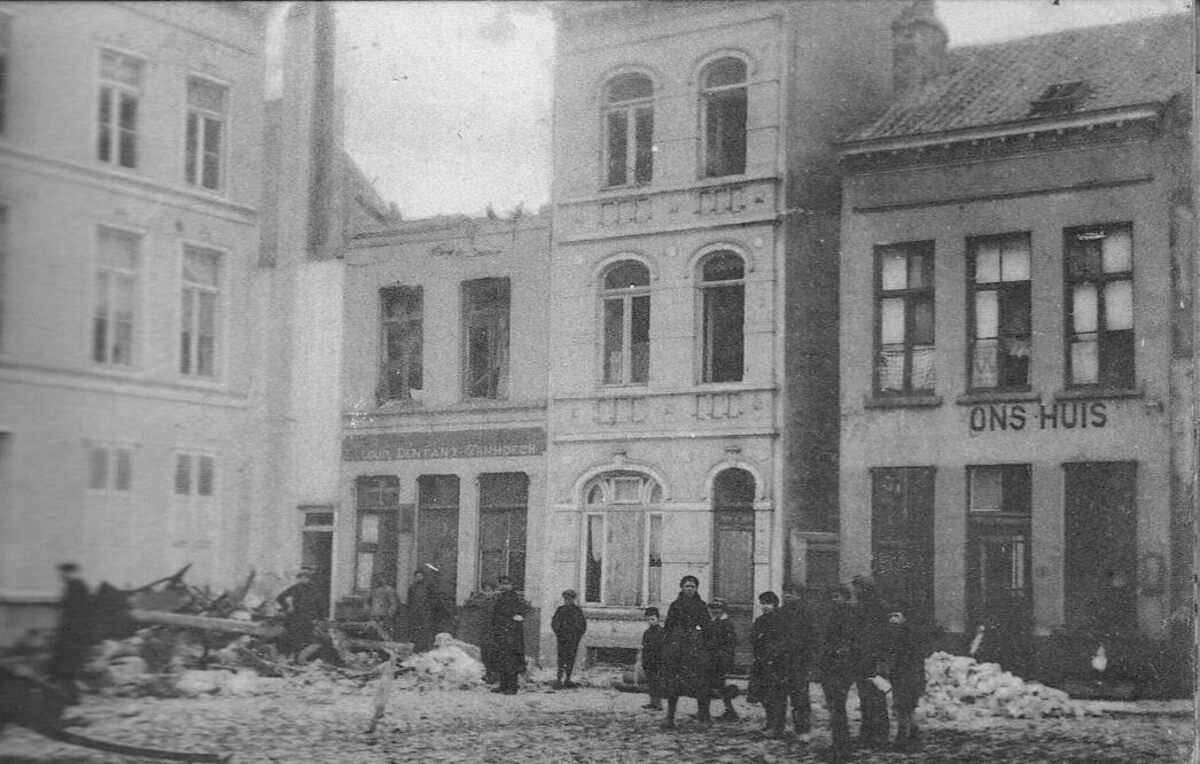 Nels. - René Baervoets, Hôtel Beerblock, Ostende. - Ostende - Oude Minne Plaats, le 22 mars 1918 : effet d'un obus. Oude Minne Place, the 22nd March 1918 : effect of a bomb. - Zie ook inventarisnummer 2017/0738. - Map 029 E-06e