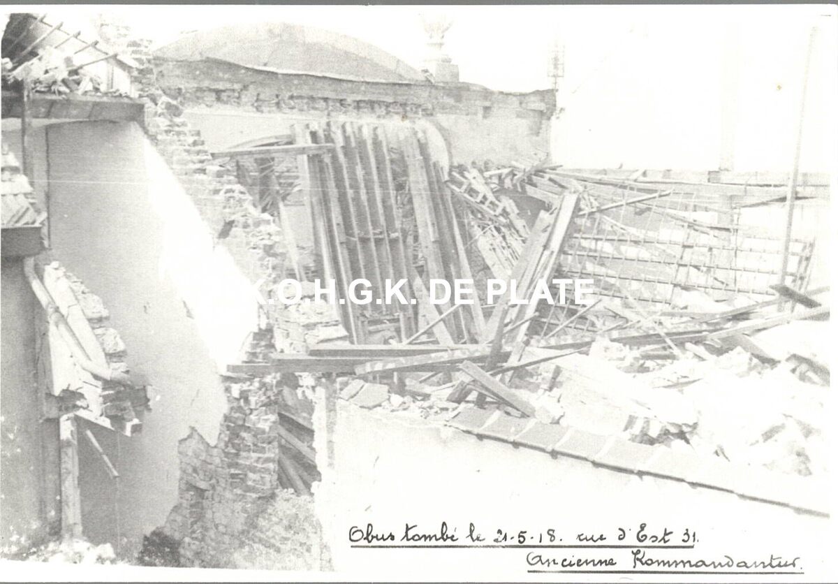 Formaat : 8,5 x 12,5 cm. - Obus tombé le 21-5-18. rue d'Est 31. Ancienne Kommandantur. - Het ingestorte dak van de Betalende Jongensschool, later Albertschool, na de beschieting van 21 mei. De gevel bleef wel overeind. Daar was de Kommandantur gevestigd en werd nadien overgebracht naar het Koninklijk Atheneum in de Sint-Peterburgstraat, nu Leon Spilliaertstraat.