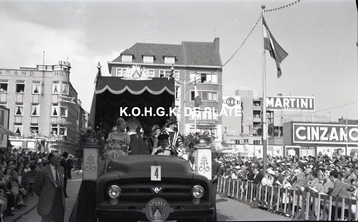 Negatief : 6 x 9 cm. - Stoet naar een ontwerp van kunstschilder Emile Bulcke. Praalwagen nummer 4 op een chassis Ford vrachtwagen van de Garage Fernand Stoops, op het Wapenplein. Achteraan zie je nog steeds wat de Tweede Wereldoorlog heeft vernield.