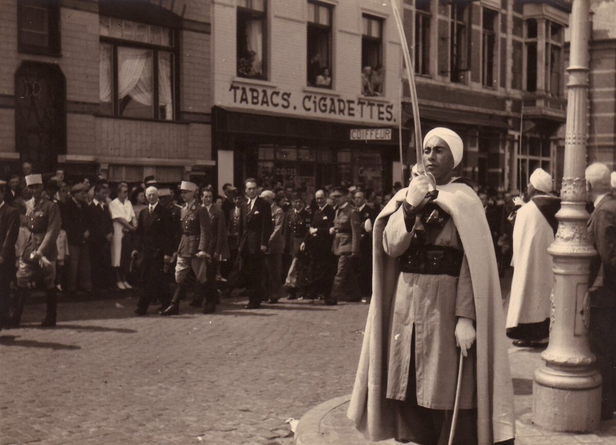 Een optocht van Franse en Belgische militairen en andere notabelen tijdens een bezoek van de spahis (Noord Afrikaanse ruiters) aan de stad. Hier aan de Jozef II-straat en het Sint Petrus en Paulusplein, van of naar het Te Deum in de Sint Petrus en Pauluskerk op onze nationale feestdag. De militair met witte boord (juist naast de Spahi op de voorgrond) is legeraalmoezenier Jean MOULAERT.