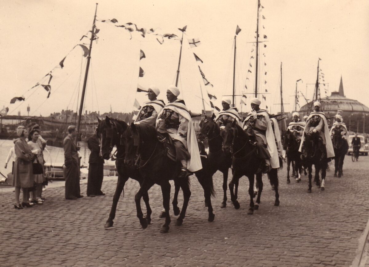 Spahis (Noord Afrikaanse ruiters in dienst van het Frans leger) komen voorbij het tweede handelsdok aan de Vindictivelaan. Op de achtergrond het gebouw van het Panorama van den Ijzer.