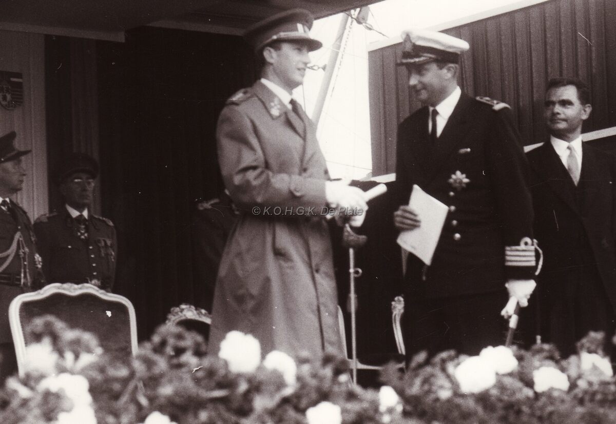 Koning Boudewijn in gesprek met zijn broer Prins Albert tijdens het Nationale defilé op de Visserskaai van 21/07/1966 te Oostende.