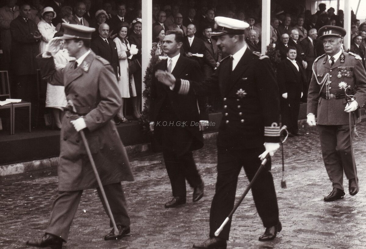 Koning Boudewijn en Prins Albert gevolgd door o.a. een legergeneraal passeren de eretribune aan de Visserskaai voor het defilé van 21-07-1966 (zie ook 2012/0108).
