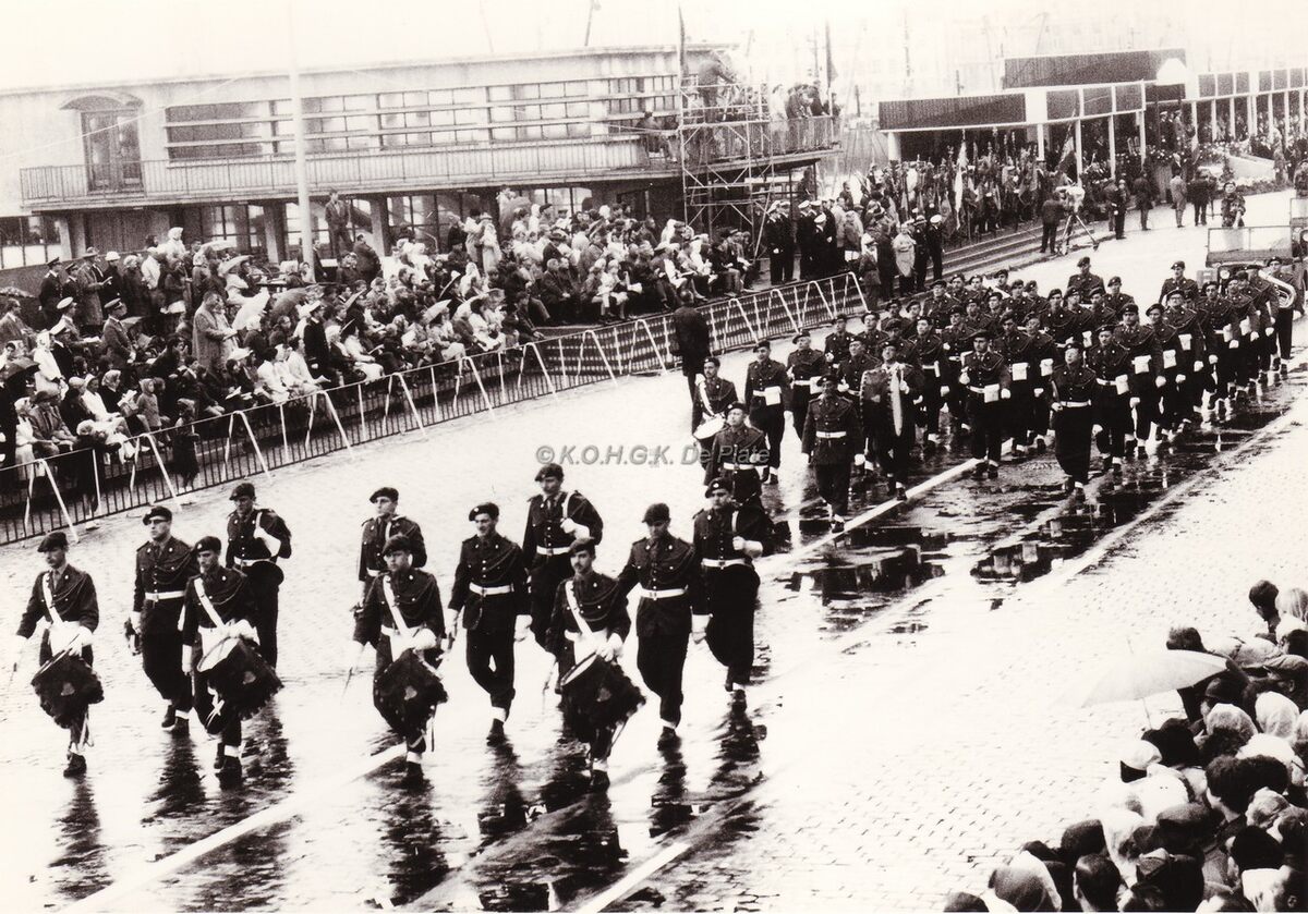 De harmonie van de Ardense Jagers aan de garnaalmijn op de Visserskaai tijdens het defilé van 21-07-1968.