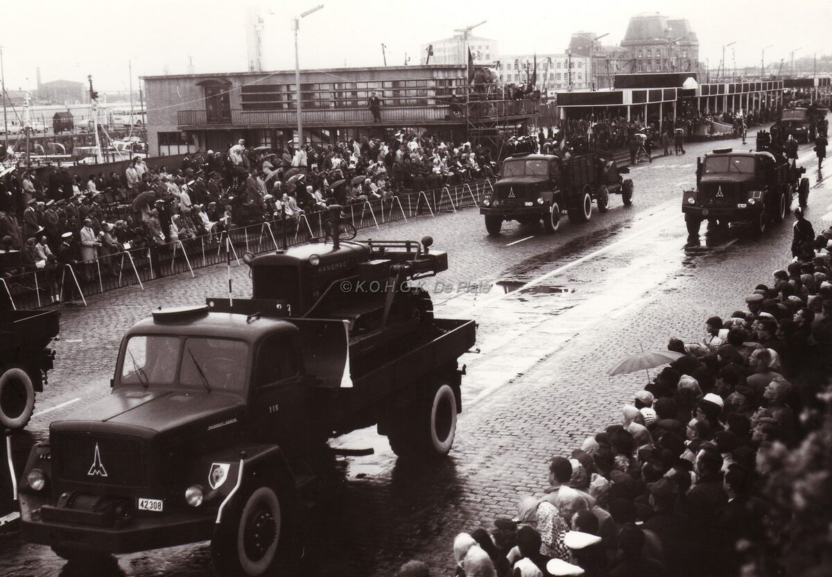 Een afdeling van de Genie passeert de garnaalmijn en eretribune op de Visserskaai tijdens het defilé op 21-07-1966. Centraal, de garnaalmijn