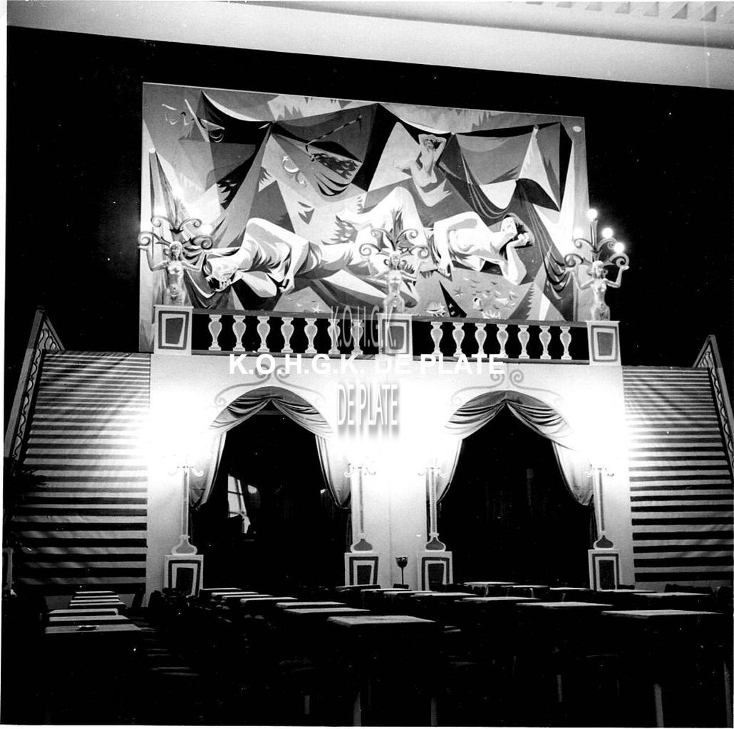 Formaat : 18 x 13 cm. - Thema : Universeel Carnaval. Decors : Raymond Pyson en Willy Bosschem. De erehal met op de achtergrond de kartonnen versie van het tapijtenontwerp van Julien Van Vlasselaer