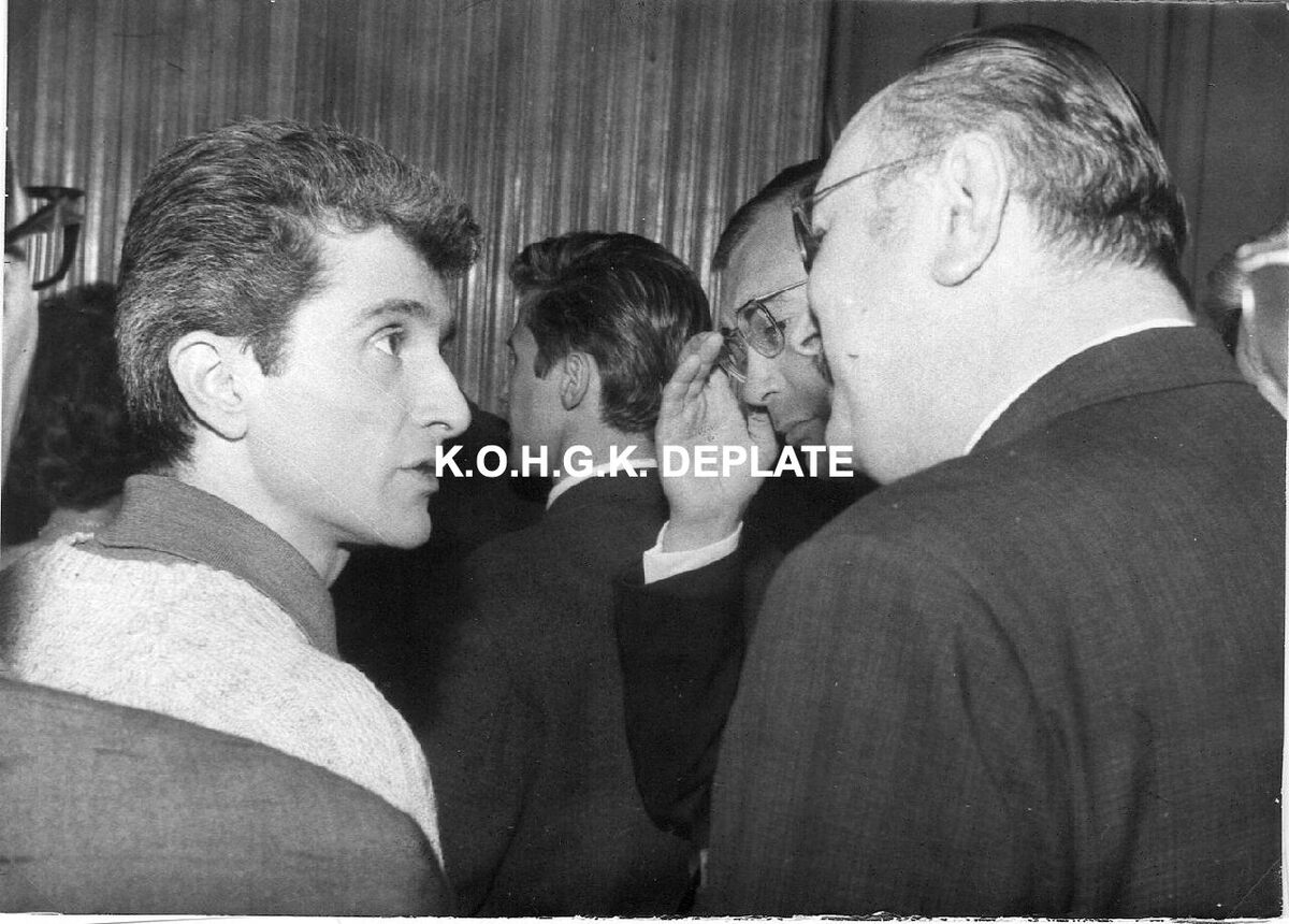 Formaat : 13 x 18 cm. - Marcel Amont in gesprek met Roger De Ramée, directeur van de Kursaal.