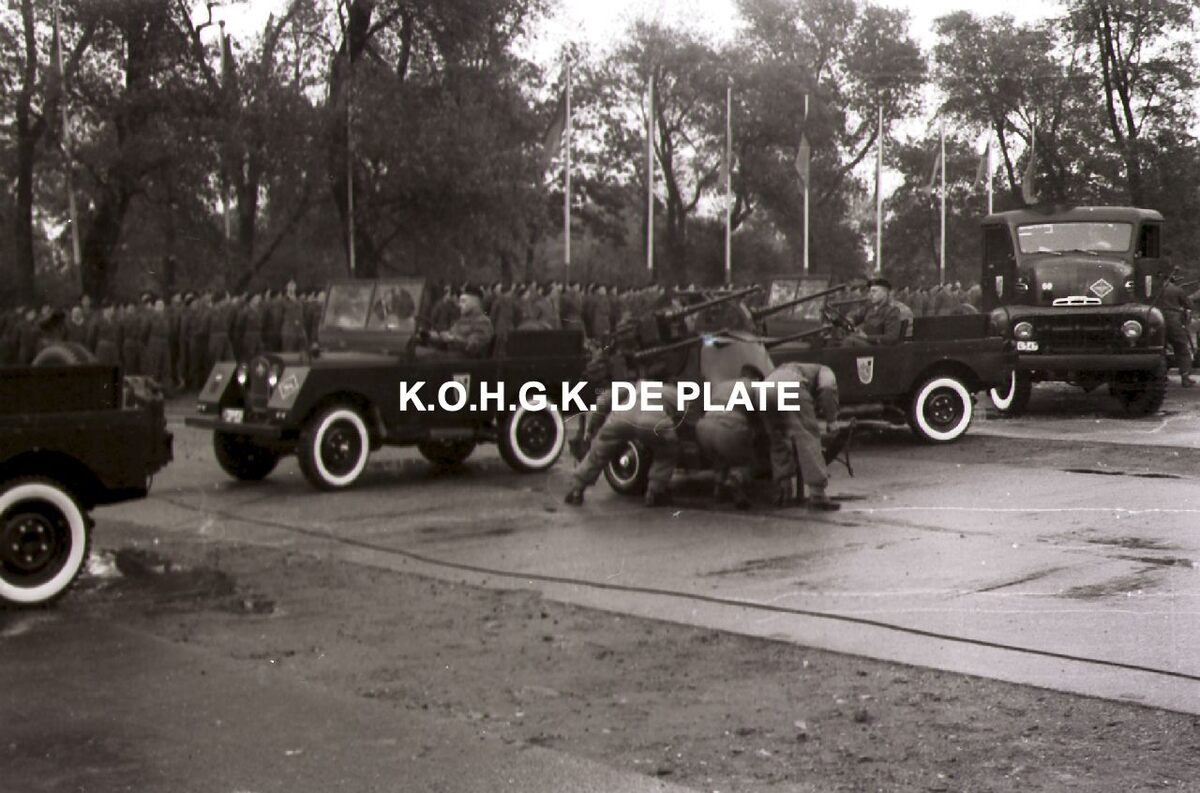 Plechtigheid bij de Territoriale Wacht voor Luchtafweer nabij de zeemachtkazerne "Bootsman Jonsen". Demonstratie van de plaatselijke afdeling van het 27e bataljon. Waren aanwezig : Kolonel Vranckx en Michel Surmont, stadssecretaris.