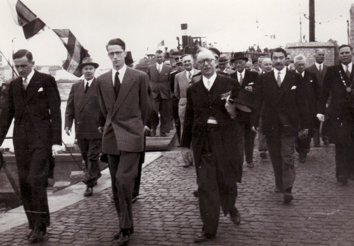 Koning Boudewijn geflankeerd door Pierre van Outryve d'Ydewalle, provinciegouverneur en burgemeester Henri Serruys, rechts, op weg naar de inhuldigingsplechtigheid van de Vismijn. Rechts achter de burgemeester, schepen Roger De Kinder