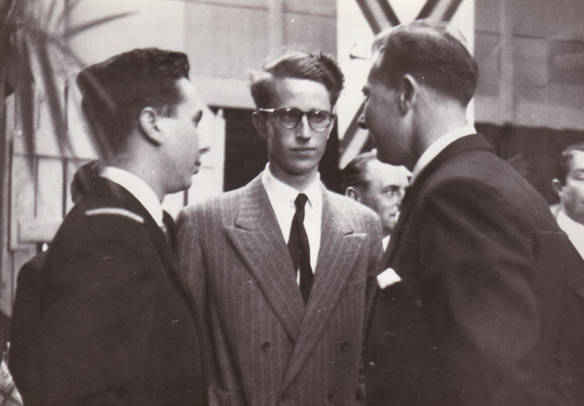 Koning Boudewijnin gesprek tijdens de inhuldiging van de Vismijn. De officier naast de koning is Daniël Geluyckens, ordonnanceoffiier. Hij was ordonnanceofficier van 1950-1959.