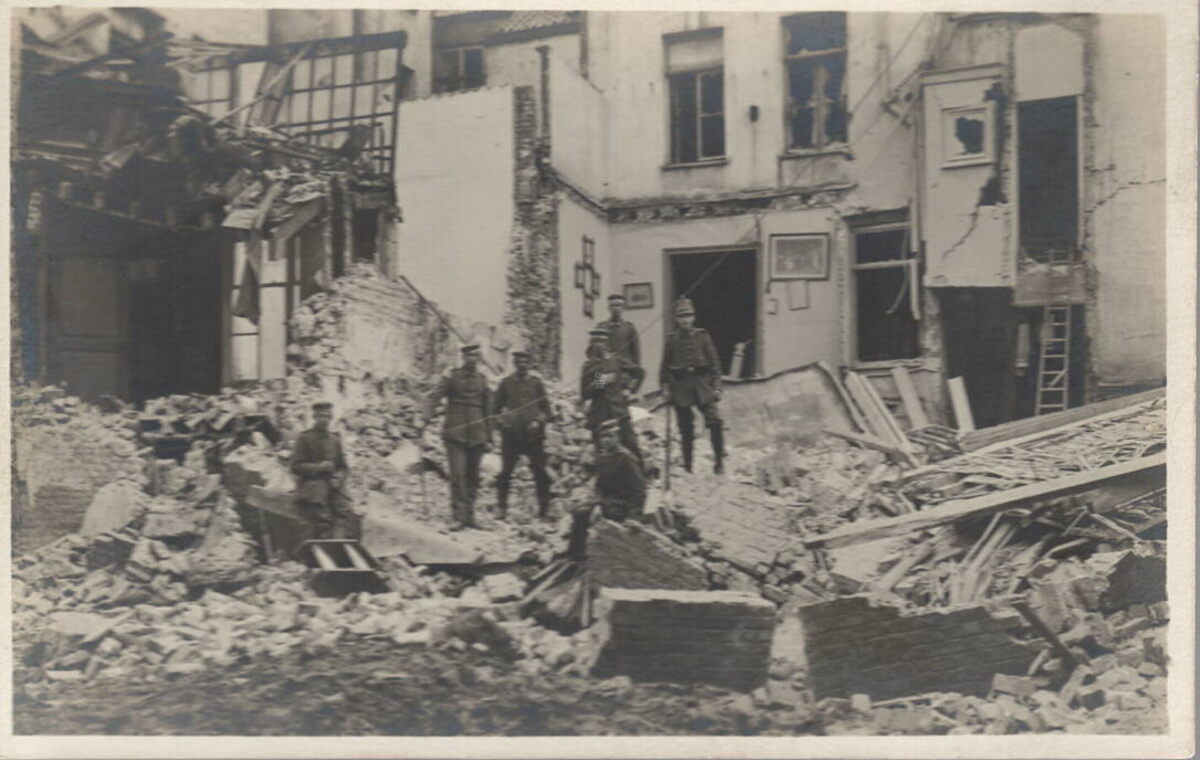 Marine Bücherei, Photographische Abteilung, Ostende. - Tijdens de beschieting van 22 september 1917 werd het hotel "Het Lammetje" in de Sint-Paulusstraat en de achterzijde van het koffiehuis Dufour in de Kerkstraat vernield.