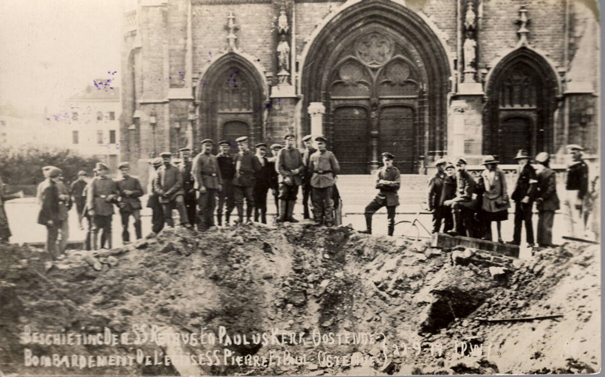 Beschieting Der S.S. Petrus En PaulusKerk - Oostende. Bombardement de L'Eglise S.S. Pierre Et Paul - Ostende 22-9-17. - Tijdens de beschieting van 22 september sloeg ook een bom in op het Sint Petrus en Paulusplein en maakte een grote krater.