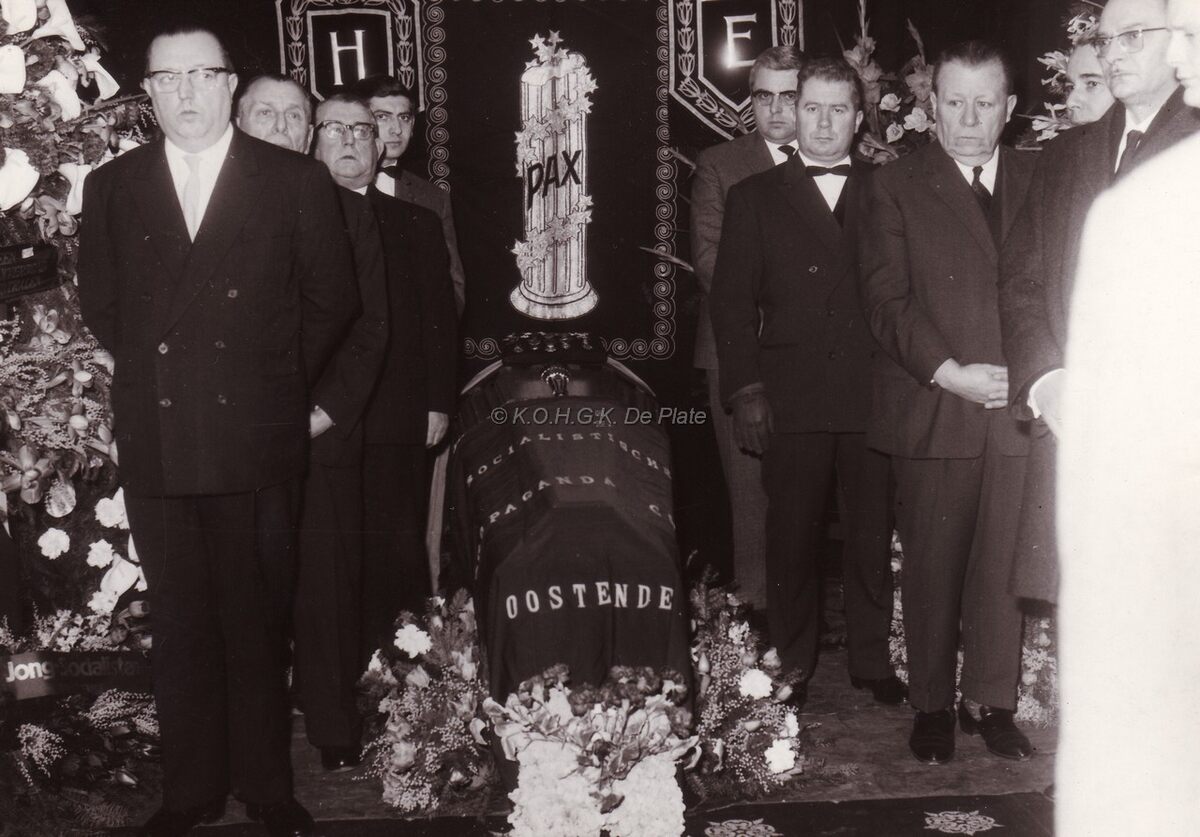 Begrafenis van Henri EDEBAU. Rouwkapel in "De Noordstar". Vooraan links John LAUWEREINS, waarnemend burgemeester, achter hem laatst in de rij Edgard MISSIAEN vrederechter, rechts Frank EDEBAU, stadsconservator, schepen Raymond MIROIR en schepen VANDEKIEBOOM. Het rouwbehangsel werd verzorgd door de firma Cyriel VANDERGUNST. Hij werd burgerlijk begraven op 23/01/1964, op het kerkhof langs de Nieuwpoortsesteenweg (nu begraafplaats Paster Pype).