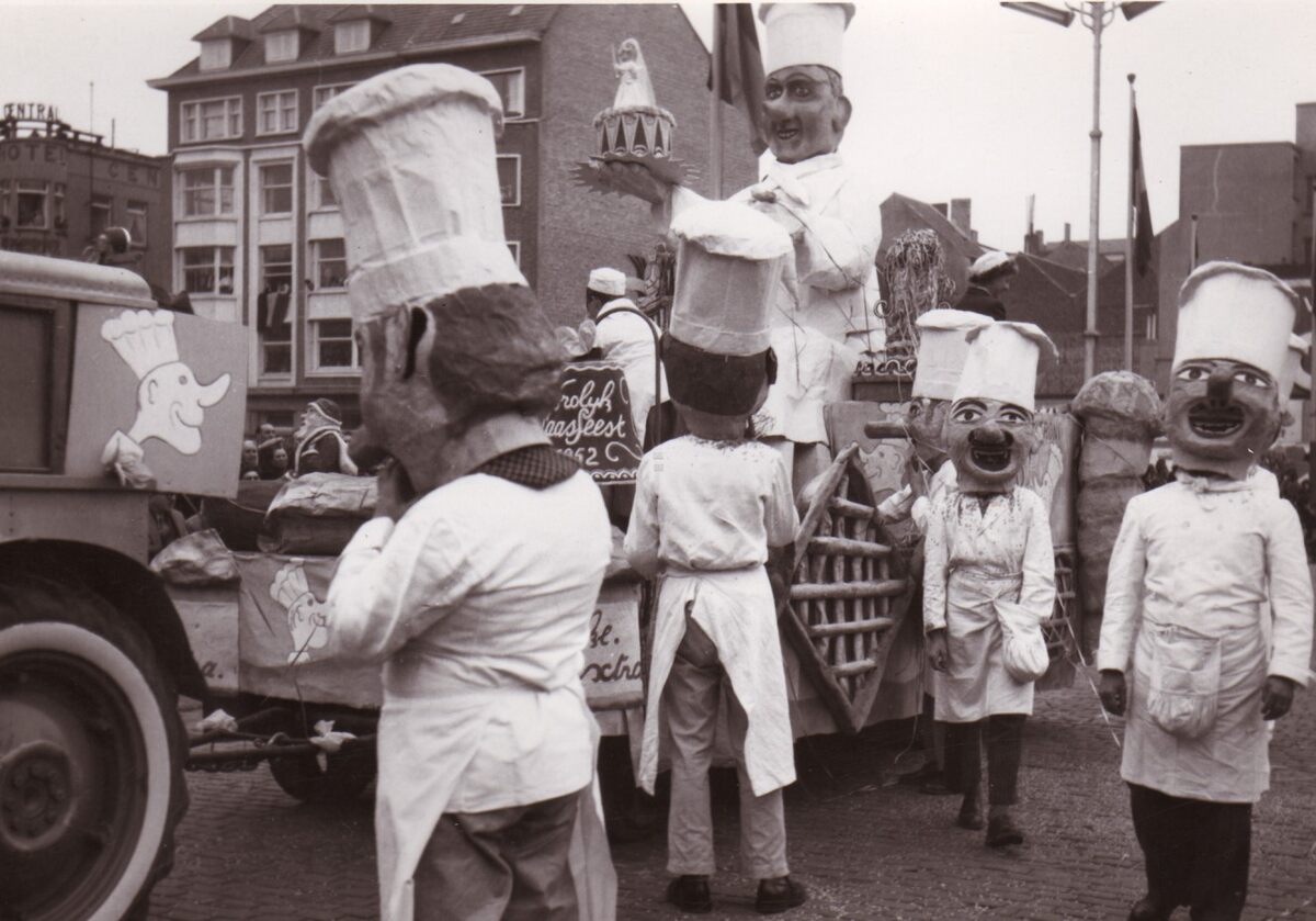 De carnavelgroep van Patisserie-Confiserie "La Couronne" met hun praalwagen in de halfvastenstoet op het Wapenplein.