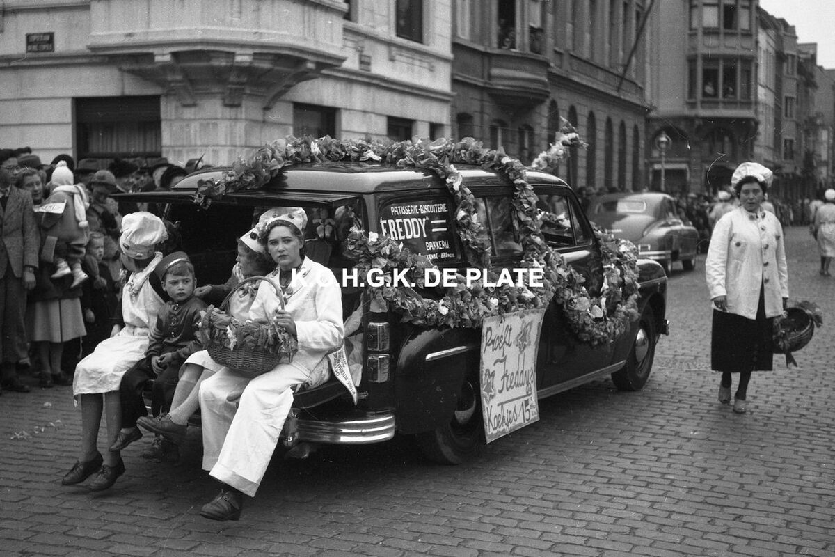 Negatief : 4 x 6,5 cm. - Met hun verierde bestelauto in de Karel Janssenslaan