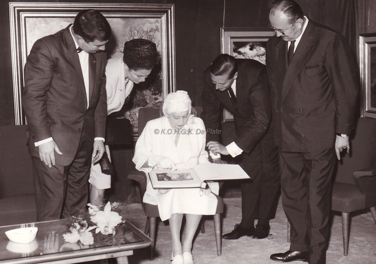 Formaat : 13 x 18 cm. - Koningin Elisabeth aanwezig op de tentoonstelling van Albert Saverys. Rechts, Roger De Ramée, directeur van het kursaal en naast hem, Jan Piers, burgemeester. Links, staat Roger De Kinder, schepen.