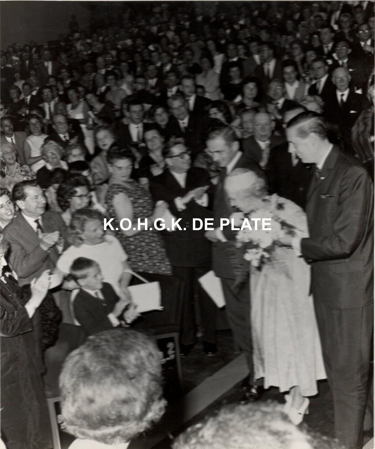 Formaat : 24 x 18 cm. - Koningin Elisabeth aan de arm van burgemeester Jan Piers, rechts, en provinciegouverneur Pierre van Outryve d'Ydewalle naar aanleiding van het Mozartconcert door het Belgisch Kamerorkest. Links, achter de dame in het wit, Florimond Corsellis, dirigent van de stadsharmonie.
