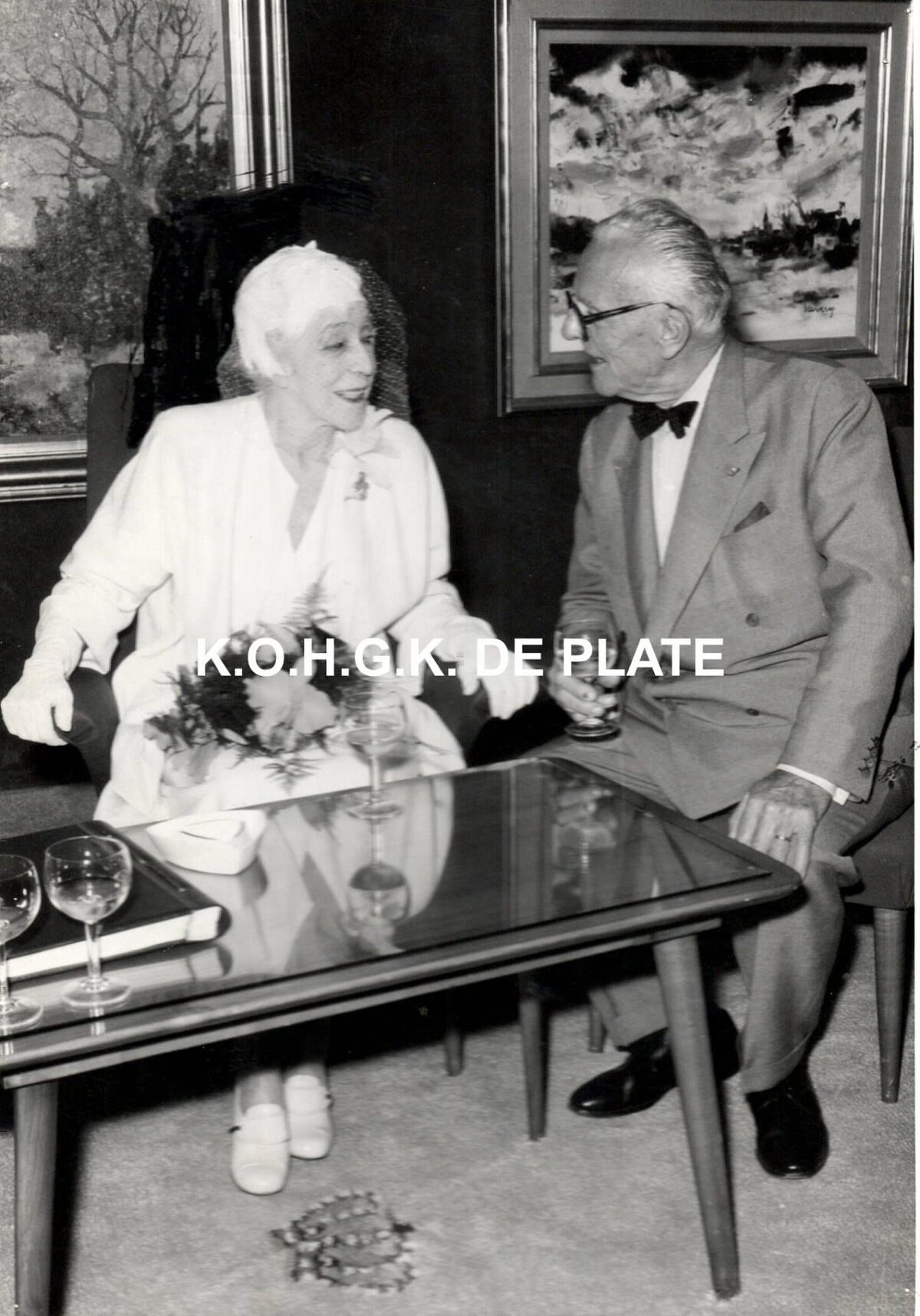 Formaat : 18 x 13 cm. - Koningin Elisabeth in gesprek met kunstschilder Albert Saverys naar aanleiding van zijn tentoonstelling in het Casino-Kursaal.