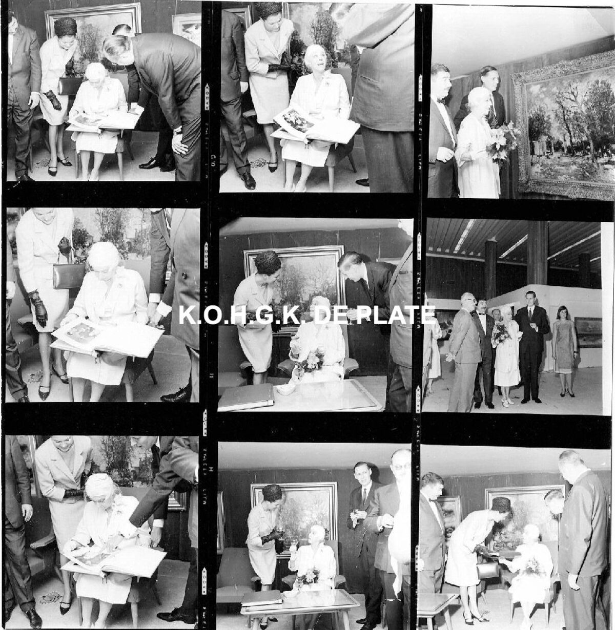 Formaat : 12 x 12 cm. - 9 foto's 4 x 4 cm. - Koningin Elisabeth bezoekt de tentoonstelling Albert Saverys