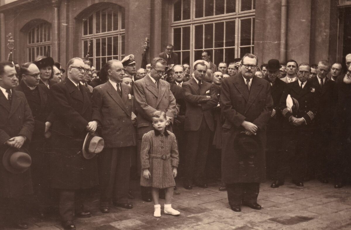 Formaat : 13 x18 cm. - Inhuldiging van een gedenkteken in de Ibisschool. Er wordt een minuut stilte in acht genomen. Vooraan eerste minister Achiel Vanacker, uiterst links burgemeester August Plovie van Bredene met naast hem de burgemeester Hendrik Serruys.