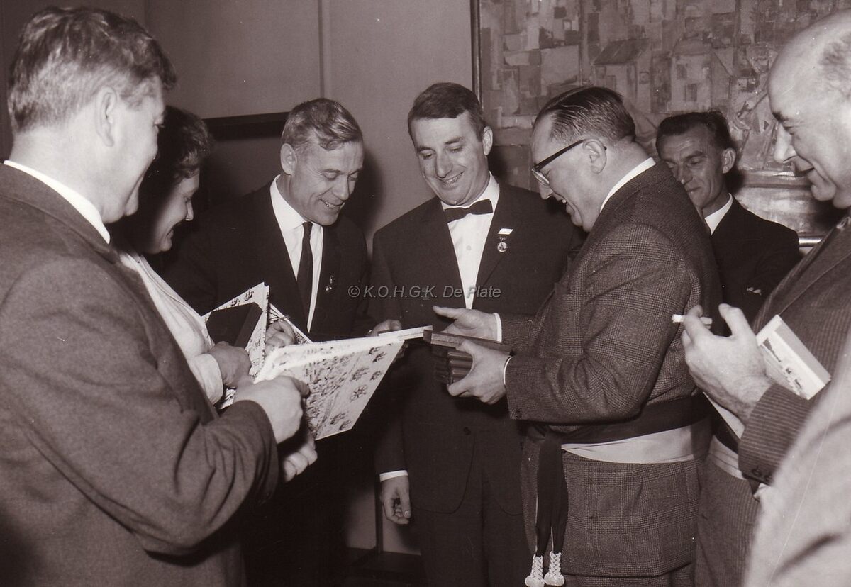 Waarnemend burgemeester John Lauwereins ontvangt een delegatie van het stadsbestuur van Stalingrad (nu Wolgograd). Rechts, Kamiel DEhouck, schepen. De aanwezige raadsleden werden door de Russische delegatie vereremerkt. De Russische delegatie ontving een geschenk van ons stadsbestuur, o.a. "L'Epopée Ostendaise" van Robert Lanoye