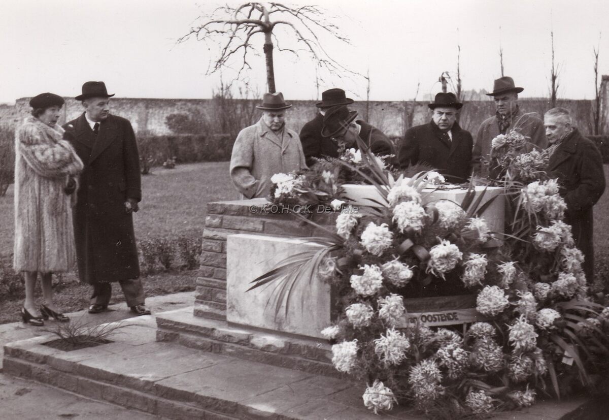 Begrafenis van James ENSOR. Familie en verwanten rond het graf. Centraal burgemeester Hendrik SERRUYS. De mevrouw links is Mariette-Alexandrine TAEN HEE TSEN, de dochter van James Ensor's zuster.