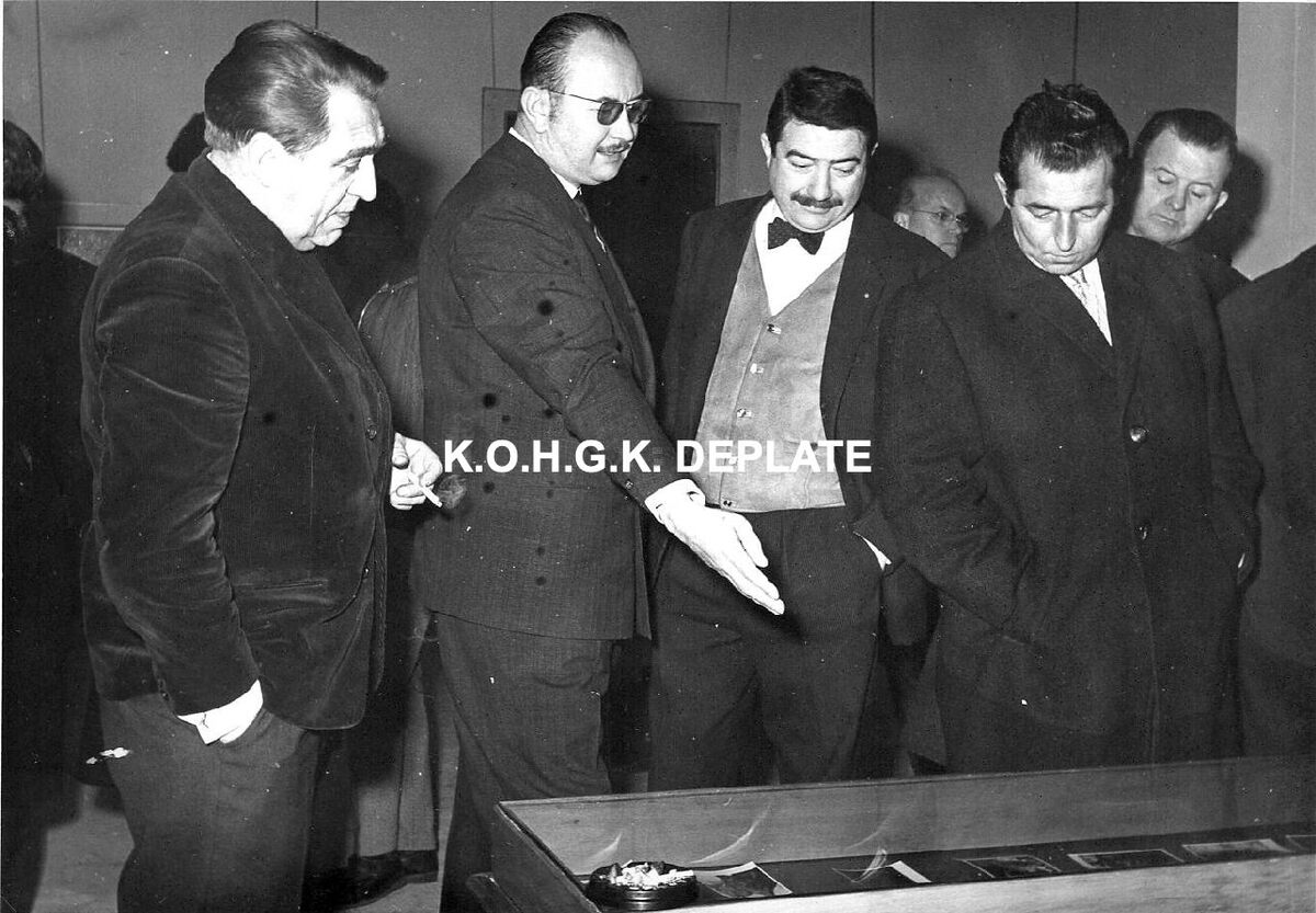 Formaat : 13 x 18 cm. - Tijdens de vernissage. Links, de kunstenaar, Roger De Ramée, directeur van de Kursaal, Roger De Kinder, schepen, ....(?)