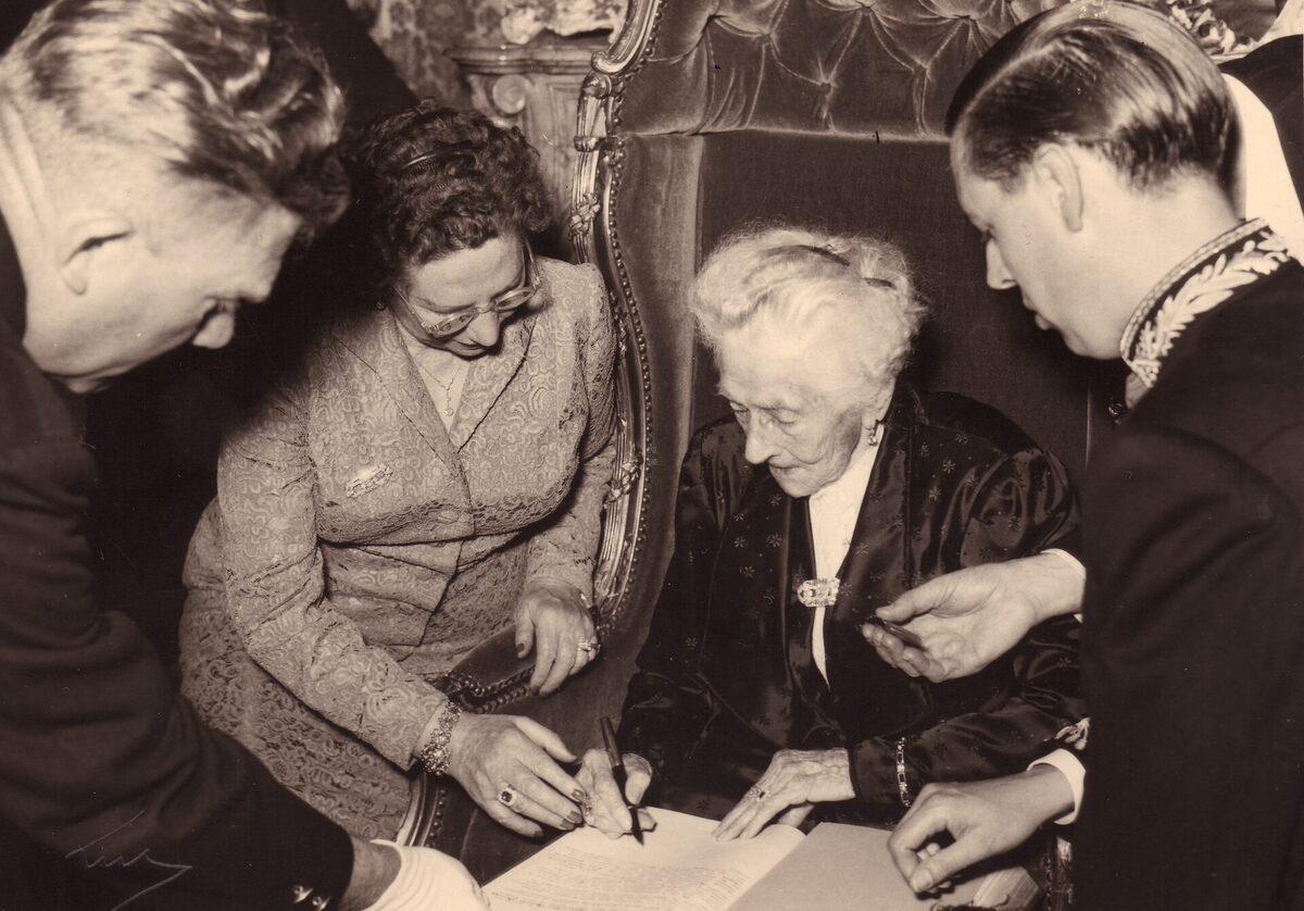 Formaat : 13 x 18cm. - De 100-jarige Mathilde Desmet tekent het gulden boek van de stad onder het oog van schepen Jan Piers.