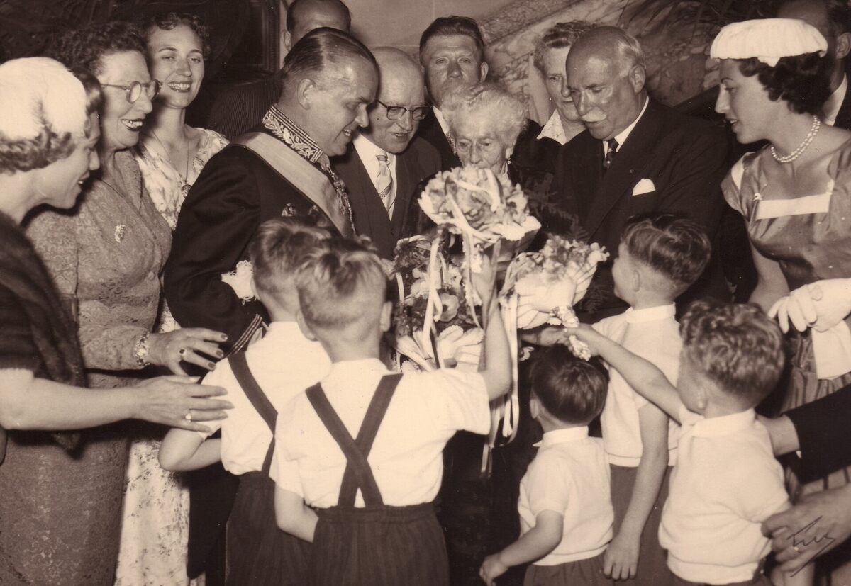 Formaat : 13 x18 cm. - De 100-jarige Mathilde Desmet wordt door achterkleinkinderen (?) in de bloemetjes gezet onder het goedkeurend oog van burgemeester Adolf Van Glabbeke.