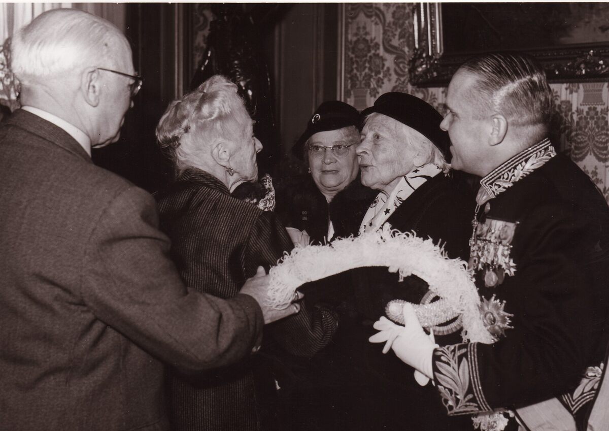 Formaat : 13 x 18 cm. - De 100-jarige Mathilde Desmet in gesprek met een andere eeuwelinge. Rechts staat burgemeester Adolf Van Glabbeke.