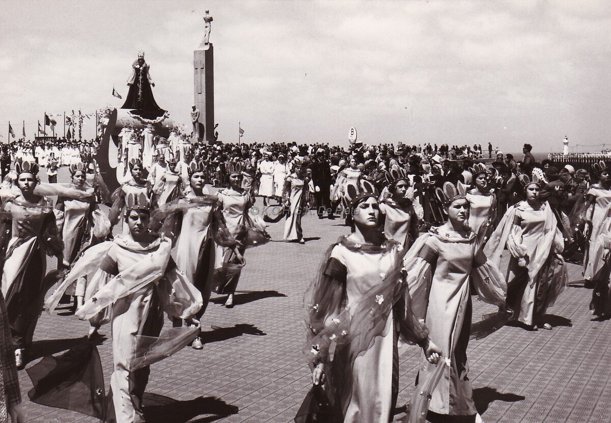 De stoet van de jaarlijkse Zeewijding op de Albert I-Promenade bij het Zeeheldenplein. Blijkbaar staat er nogal wat wind !