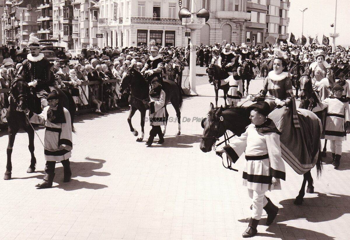 Een groep ruiters uit de jaarlijkse Zeewijdingsstoet op de Albert I-Promenade ter hoogte van het Zeeheldenplein en de Van Iseghemlaan.