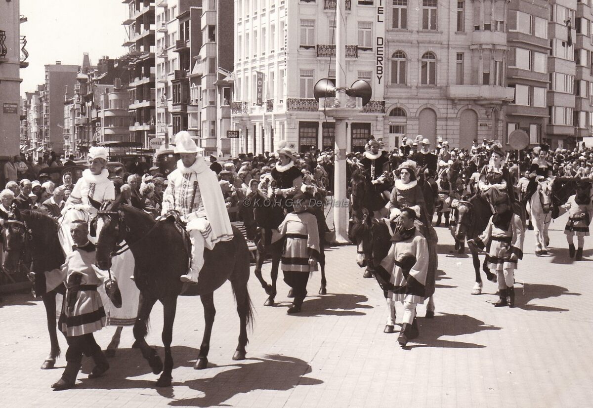 De stoet van de jaarlijkse Zeewijding. Albrecht en Isabella, met gevolg, komen aan op de Albert I- Promenade, nabij de Van Iseghemlaan en het Zeeheldenplein. Op de achtergrond hotel Derby