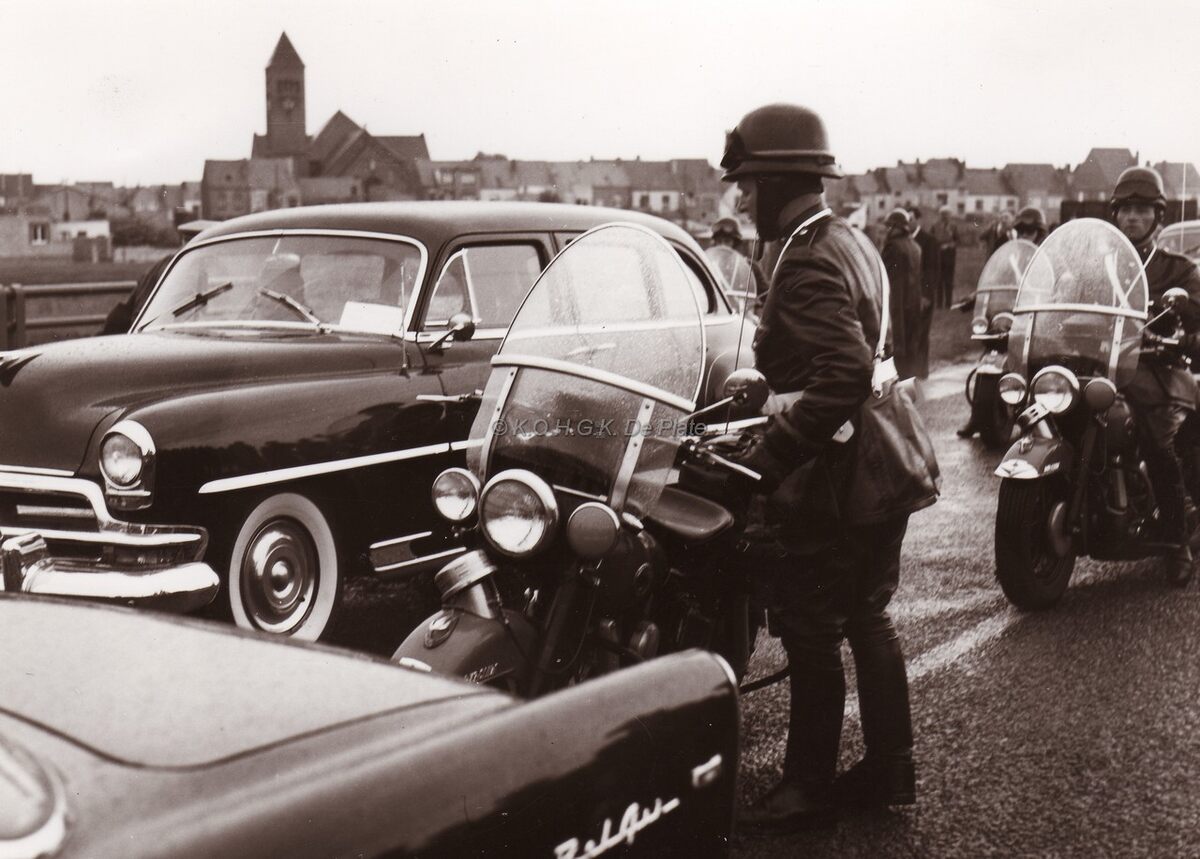 Een escorte van rijkswachters op de moto (de zwaantjes) wachten aan het Kennedy rondpunt de prins en prinses van Monaco op ter gelegenheid van de jumelage tussen Oostende en Monaco. Op de achtergrond de wijk Konterdam, met de Sint-Catharinakerk.