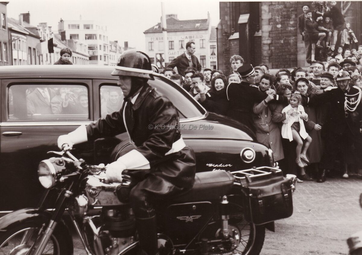 Het prinsenpaar van Monaco rijdt weg van de Sint Petrus en Pauluskerk na een dienst aldaar tijdens de jumelage Oostende-Monaco.Op de voorgrond een gemotoriseerde agent van Gemeentelijke politie Oostende.