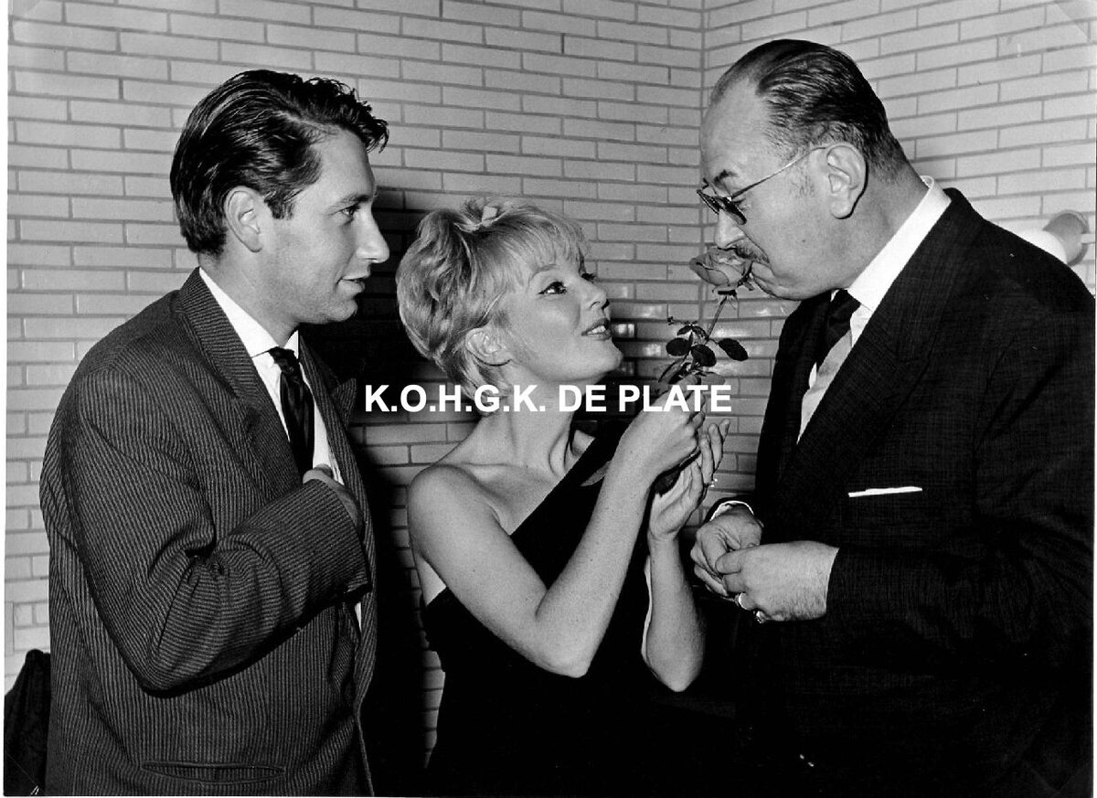 Formaat : 17 x 23 cm. - Petula Clark in het gezelschap van Roger De Ramée, directeur van de Kursaal (rechts) en Jean-Claude Mennessier, reporter bij de Franstalige radio-omroep. Roos van Louis Lens genaamd "Petula Clark".