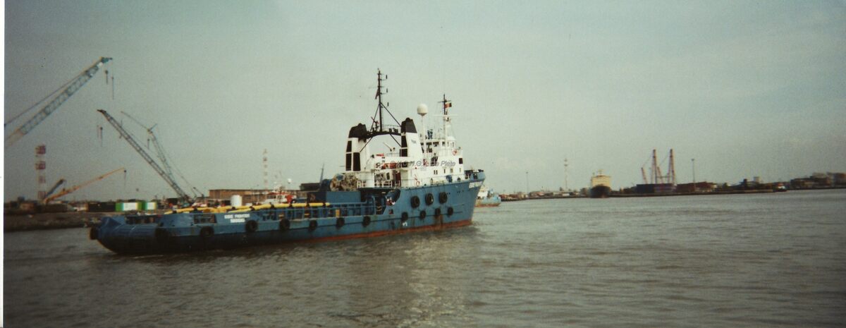 Een zandzuiger (Boe.....) vaart Oostende binnen.