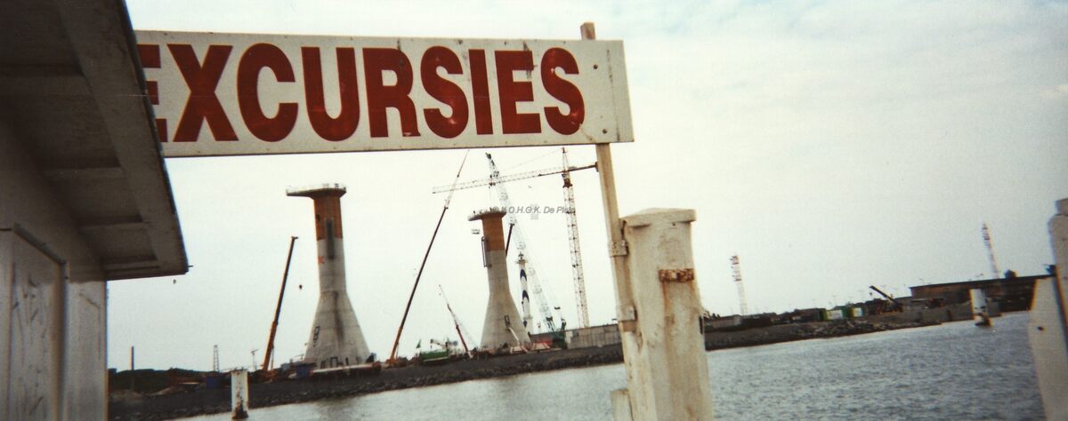 Formaat : 25 x 7 cm. - De havengeul met zicht op de oosteroever en de bouw van de betonnen sokkels van de windmolens. Gezien vanaf het Weststaketsel nabij de inschepingsplaats van de "Franlis"