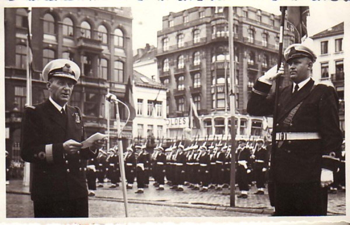 15 Foto's z/w 14cm x 9cm in album. De Vice Admiraal Gaynal (Franse Marine) speldt het Franse oorlogskruis op de vlag van de Zeemacht.