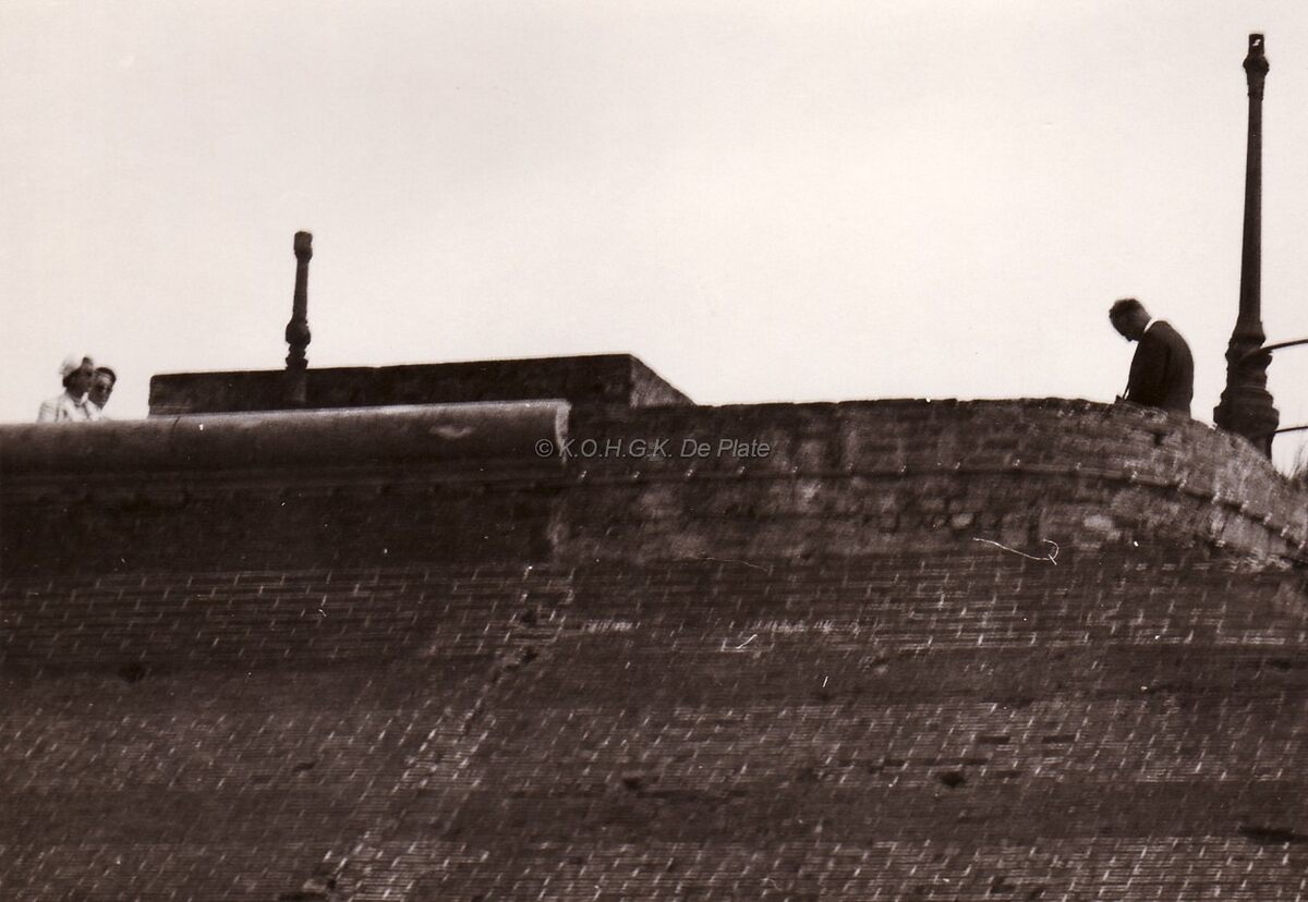 Formaat : 13 x 18 cm. - Koning Leopold III fotografeert zijn echtgenote, Prinses Lilian Baels bij de puinen van het Koninklijk Chalet.