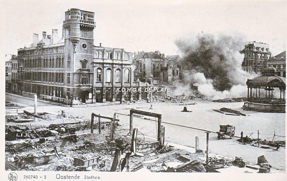 Nels, N° 260740-3. - Oostende - Stadhuis. - Men ruimt puin na de verwoestende bombardementen van mei 1940. Het stadhuis ligt volledig in puin, alleen de muziekkiosk bleef overeind.