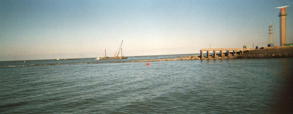 Formaat : 25 x 10 cm. - De havengeul en wat nog rest van het Ooststaketsel. Rechts, de radartoren op de oosteroever. Werkboot "De Bever" op de achtergrond.
