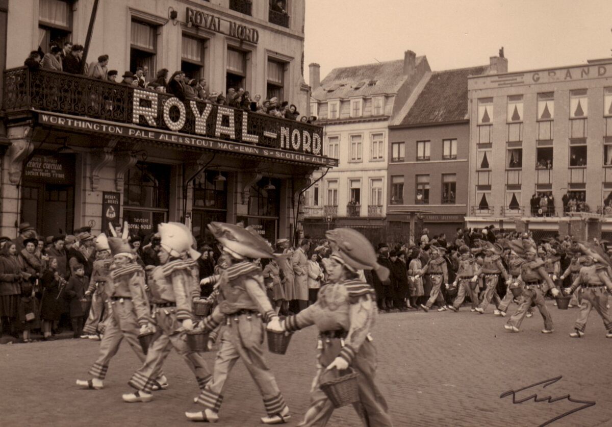 De "Gilles der Zee" in de halfvastenstoet, voor de "Royal Nord" op het Wapenplein. Links de ingang van de "Cercle Coecilia". Op de luifel reclame voor de bieren : Worthington Pale Ale & Stout. MacEwan's Scotch-ale.