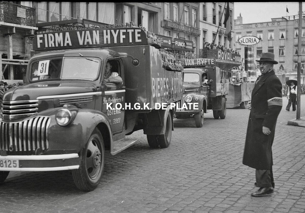 Negatief : 4 x 6,5 cm. - Twee vrachtwagens van bierhandel "Van Hyfte", Aartshertoginnestraat 18, in de publiciteitscaravan op het Wapenplein