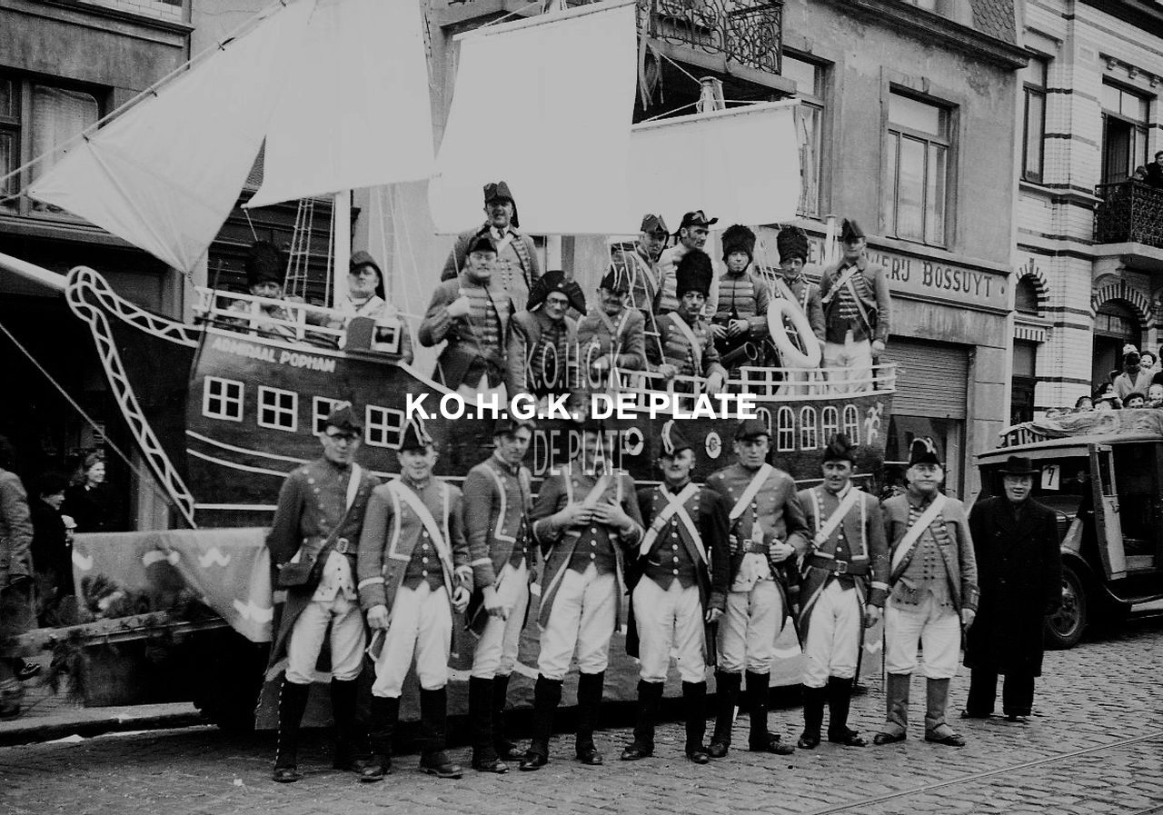 Negatief : 4 x 6,5 cm. - Praalwagen admiraalschip "Popham" bemand door leden van de "Koninklijke Maatschappij de Vereenigde Karabijnschutters" uit Bredene, hier op de Torhoutsesteenweg