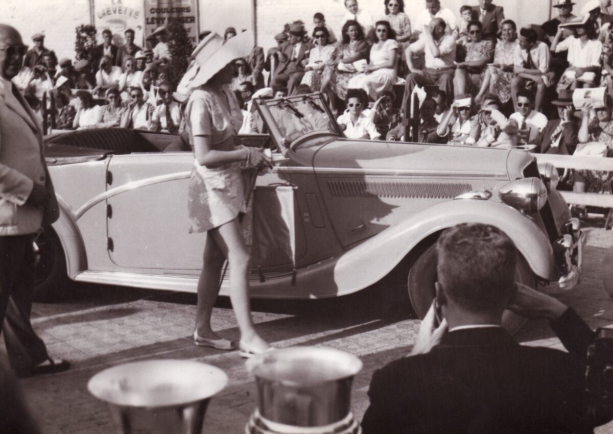 Formaat : 13 x 18 cm. - Wedstrijd voor auto's op de Albert I-Promenade. Een deelnemer passeert de jury aan de site van het nog niet herbouwde Kursaal.