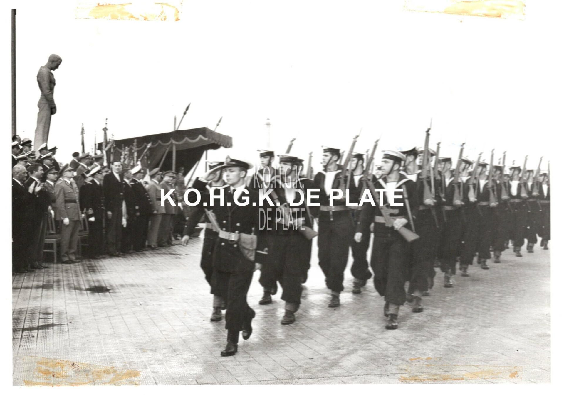Formaat : 13 x 18 cm., beschadigd. - De troepen defileren voorbij de eretribune nabij het Monument der Zeelieden. We herkennen o.a. van links naar rechts : de schepenen Kamiel Dehouck en Roger De Kinder, kapitein-ter-zee Jules Delforge, burgemeester Jan Piers...
