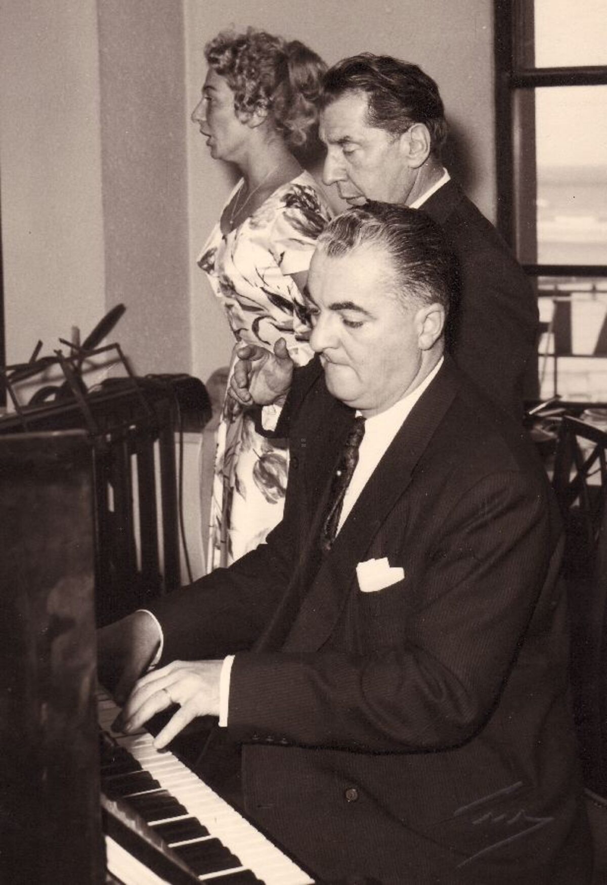 Aan het klavier Joseph Berden, ook orgelist van de Sint-Jozefskerk, tijdens een banket van het SEO-personeel in het Hotel Wellington. Achter hem Florimond Corsellis, dirigent van de stadsharmonie, en zangeres Jacqueline Monteyne. Banket naar aanleiding van de viering van bestuurder Maurice Nenquin.