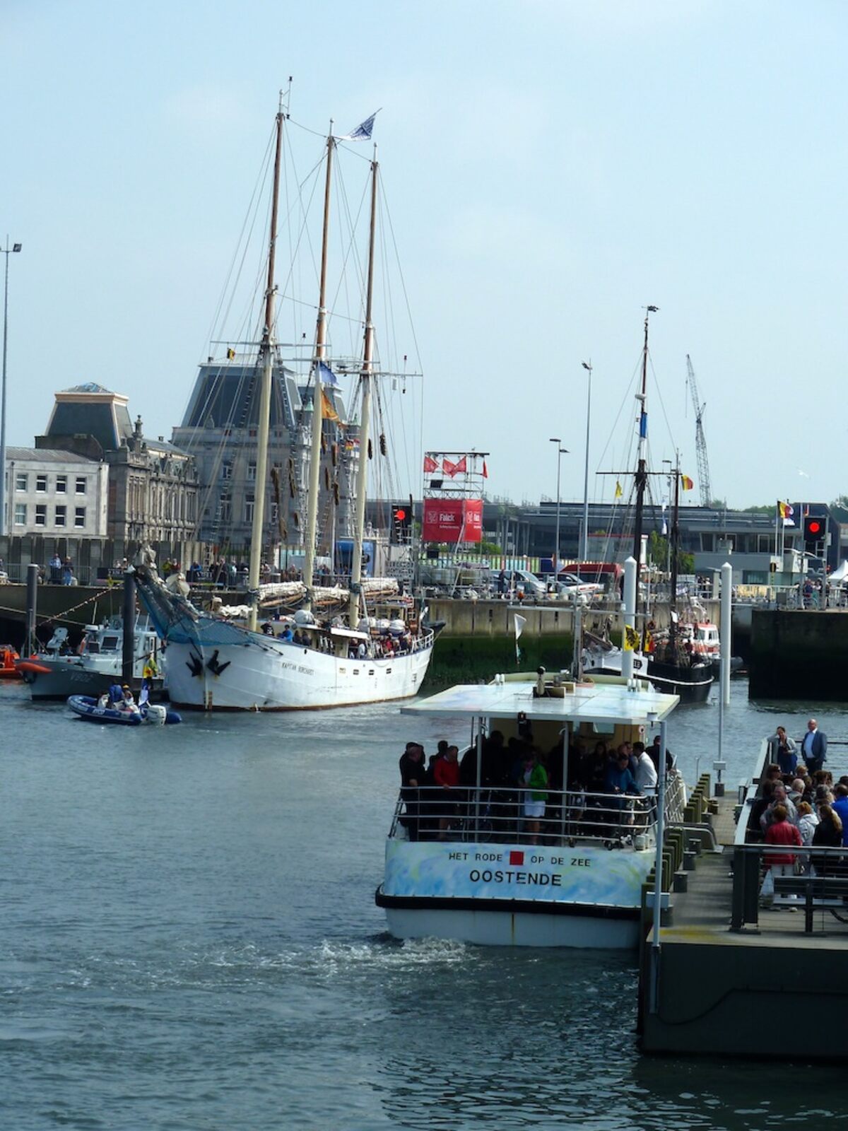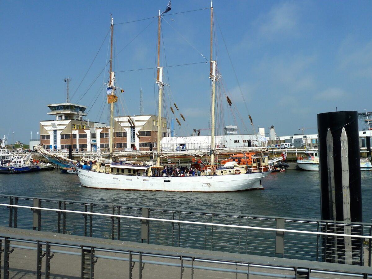 3 foto's : De "Kapitan Borchardt" een driemastschoener uit Gdansk verlaat het Montgomerydok voor een tochtje op zee.