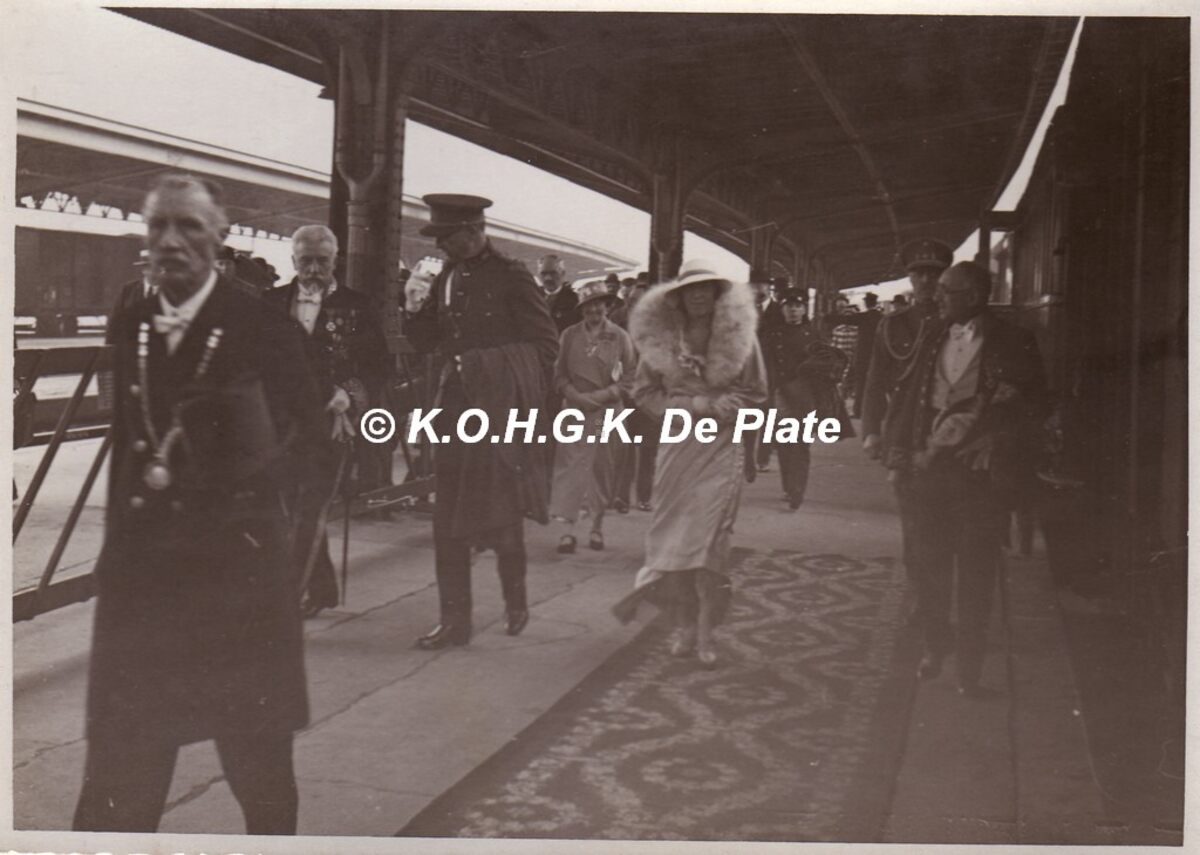 Formaat : 18 x 13 cm. - Aankomst van Koning Albert I en Koningin Elisabeth in het Zeestation voor de inhuldiging van het "Palais des Thermes". Links, schepen Georges Verhaeghe en rechts burgemeester Edouard Moreaux